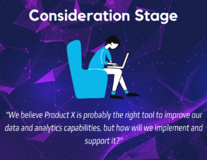 In the Consideration Stage, the prospect has a clearly defined need and is researching different ways to solve their problem (ie, “we believe Product X is probably the right tool to improve our data and analytics capabilities, but how will we implement and support it?”).