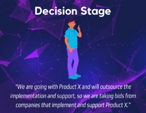 A Prospect in the Decision Stage has already formulated their idea of both the problem and the solution (ie, “We are going with Product X and will outsource the implementation and support, so we are taking bids from companies that implement and support Product X.”).